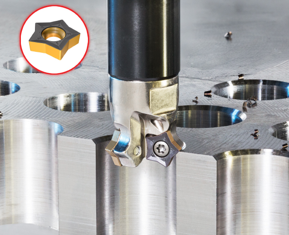 伊斯卡推出可转位铣刀CHAMFMILL系列,夹持五角星形刀片PNMT 06,5个切削刃用于正倒角,5个切削刃用于反倒角,提供了非常经济的加工解决方案。带5个角,共10个切削刃的五角星形刀片由伊斯卡技术前沿的束魔技术(SUMO TEC)合金牌号IC830制成。